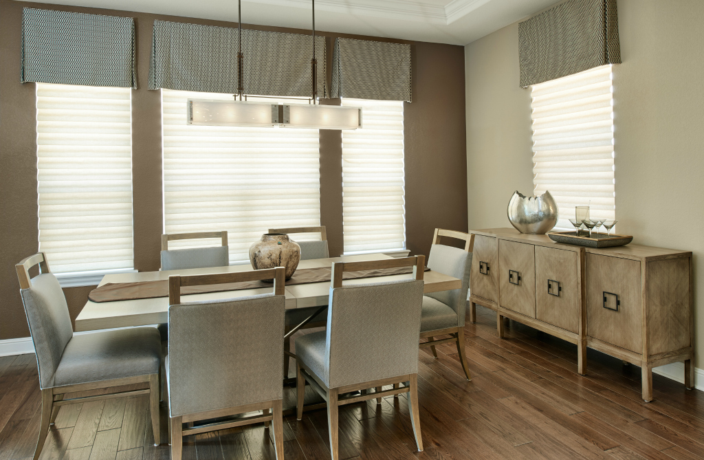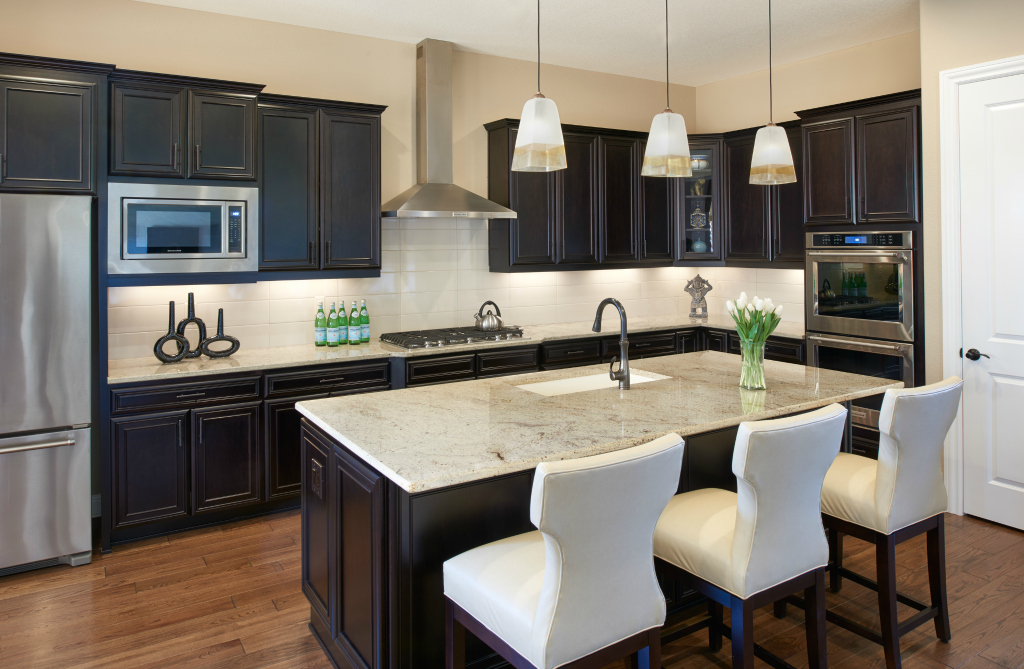 With few options to change in the builder’s floor plan for the kitchen and dining areas, the couple chose shades of brown and gray with metallic accents to produce a sleek and polished modern dining area. The kitchen features black-stained cabinetry and natural stone countertops and boasts a large island with added seating and upgraded flooring. Glass pendant lights and stainless appliances against a gentle white backsplash complete the contemporary style.