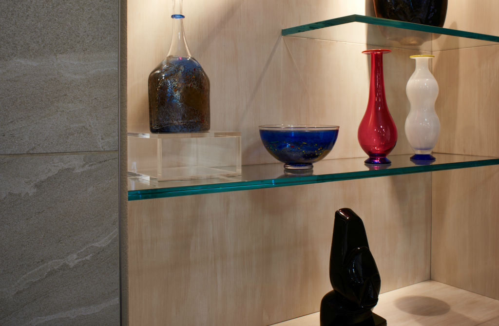“Our clients like to entertain, and with their growing family of grand-kids, we focused on the great room and creating a fun entertainment space for them, their family and friends. We tiled the entire wall housing the fireplace with natural stone and the results are both stunning and relaxing We worked with a local artisan who customized a built-in bookshelf for the great room which highlights their collection of exquisite glass pieces. The timeless shelving added storage and hid the wall-hanging TV components,” Wood says.