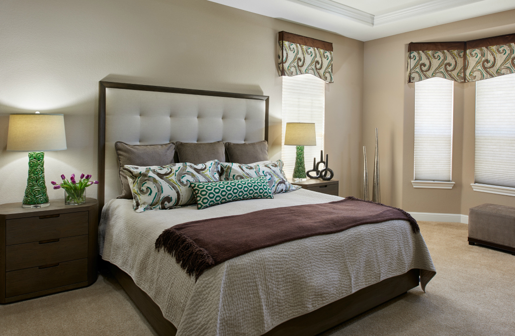 Furnishings complement the décor. Finishes including flooring, accessories, window treatments and paint colors embody the couple’s preference for understated color. A subtle blue or green accent color is woven throughout custom-made pillows, upholstery, window valances and chairs adding pattern and texture to every room. The lavish home continues to impress in the bedroom as textured accessories in green hues and earthy tones create a warm, soft space for sleep and relaxation.