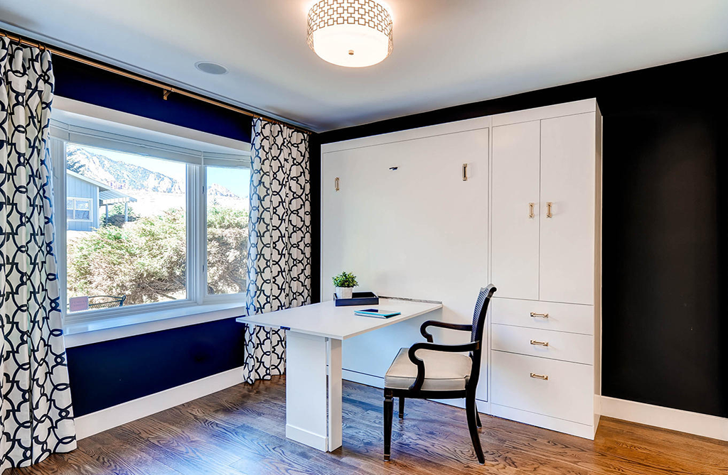 A recent downsizing project allowed a young couple to create a three-in-one, multi-purpose room in their townhome. One room is a guest room, exercise room and an office. Wood chose a custom Murphy bed with a drop-down desk — when the bed and desk are folded up, it’s an exercise room. When the desk folds down the room becomes an office; when the bed folds down, it’s a guest room.