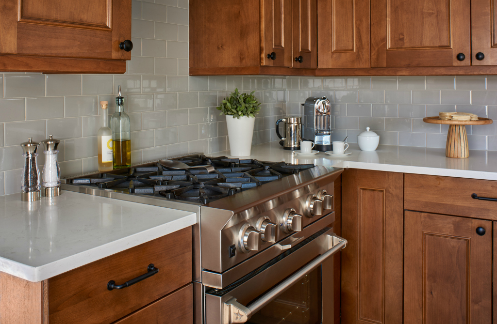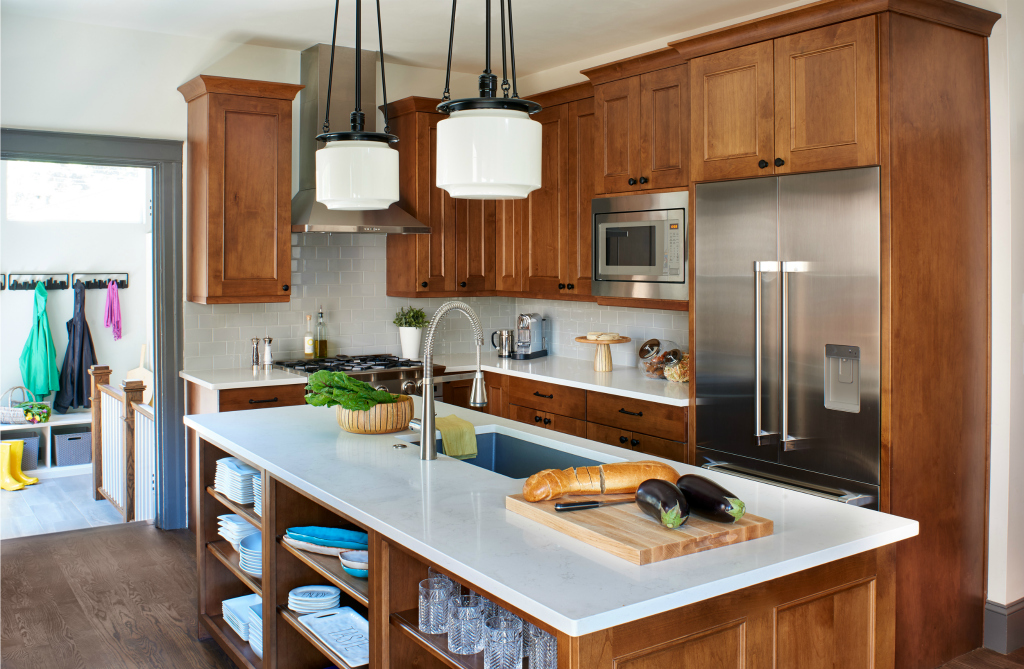 Remodeling the kitchen required creativity given an 11×7 footprint that could not be changed. The goal was to maximize the space, make it functional and add professional grade appliances. Standard upper cabinets are 12 inches deep but creating 15-inch deep cabinets allowed for ample storage. Wood added an island with open shelves for additional counter space and for storage space while creating a boundary between the kitchen and a redesigned mud room.