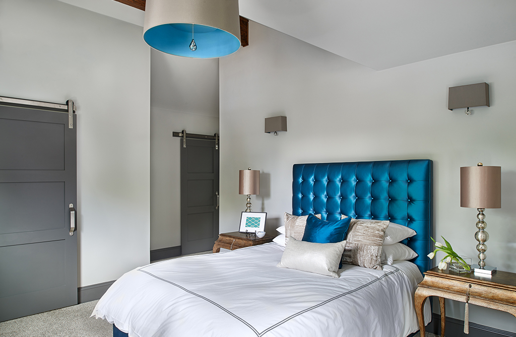“Light fixtures are a great way to add personality. We have these nice vaulted ceilings in the upper bedrooms and along with that exposed beam we needed fixtures that had a presence because there’s a lot of volume in the ceiling. I knew my client had this stunning blue headboard and I found a drum light that was blue under the shade that would take up the ceiling’s volume Those two things couldn’t have lined up more beautifully,” shares Wood, who credits her ability to find the perfect accessory to knowing the right vendors.